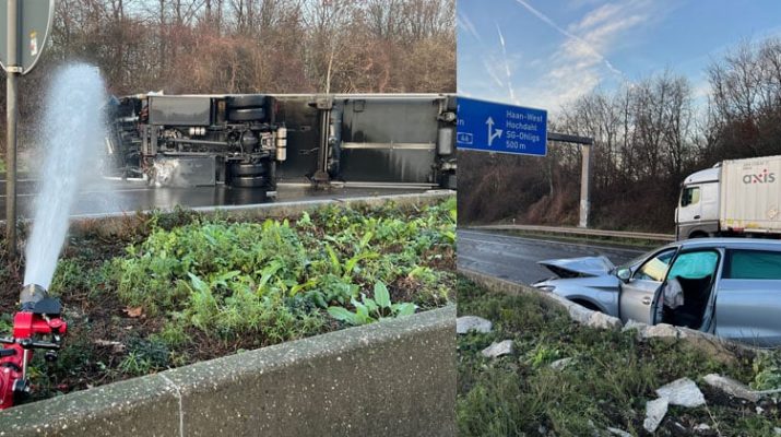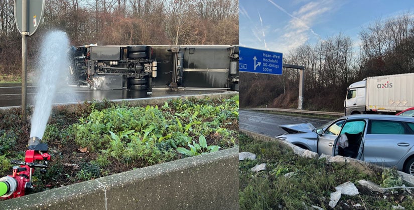 Auf der A46, zwischen den Anschlussstellen Haan-Ost und Haan-West, ist am Donnerstagmittag, 11. Dezember 2025, gegen 13.50 Uhr ein mit Gefahrgut beladener Lkw verunglückt und auf die Seite gestürzt. Die elektrisch angetriebene Zugmaschine ist im Bereich der Hochvoltbatterie in Brand geraten. Vermutlich ist ein PKW von hinten aufgefahren.
