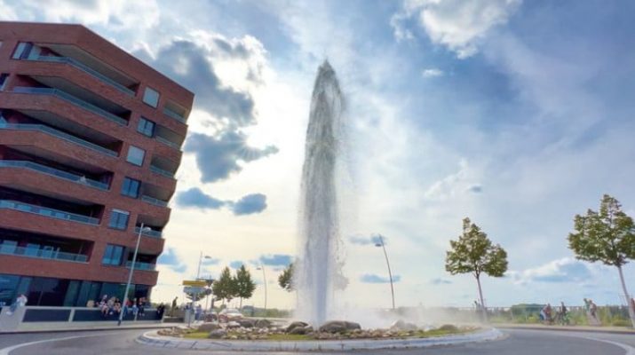 Geysir bricht am Mittwoch wieder aus Nach mehreren sonnigen Tagen wird der von Thomas Stricker geschaffene Geysir im Kreisverkehr an der Rheinpromenade wieder aktiver.