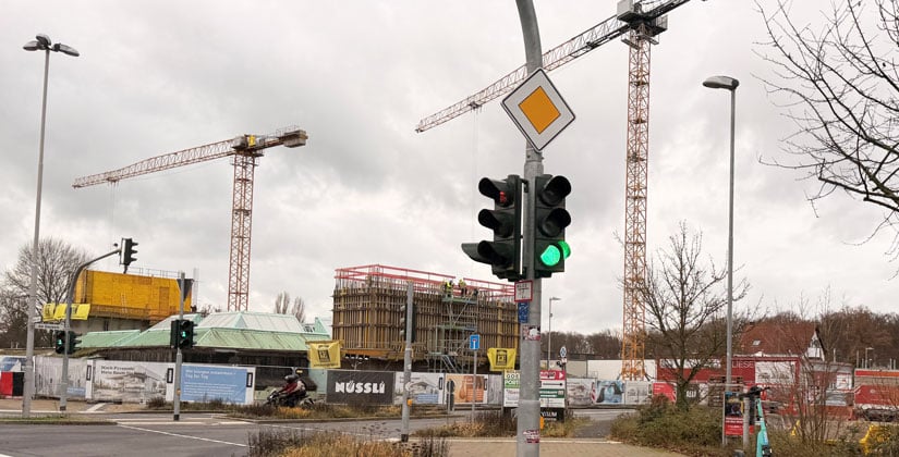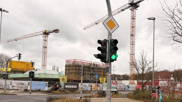 Foto oben mit Symbolcharakter: Baukräne zeugen von reger Tätigkeit, die Ampel steht auf grün, aber im Hintergrund zieht ein Unwetter heran…