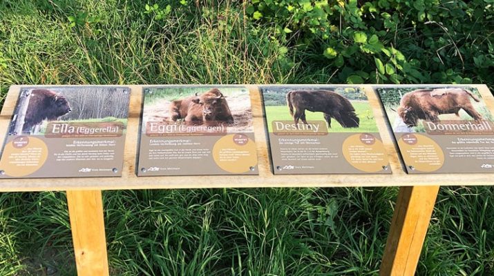 Interessierte erfahren die Namen der Tiere und wie sie anhand ihrer jeweils außergewöhnlichen Merkmale unterschieden werden können. Gleichzeitig beschreiben die Texte auf den Tafeln besondere Gewohnheiten oder Charakterzüge der Wisente und Heck-Pferde. Auch allgemeine Informationen über die Tiere sind dort vermerkt.