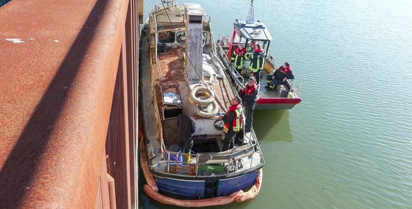 „Nach der Erkundung stellte sich heraus, dass bei einem Schleppvorgang Wasser in den Maschinenraum des Bootes eingedrungen war und sich dort mit Kraftstoff oder Öl gemischt hatte“, vermeldet die Feuerwehr Leverkusen. „Da das Boot nur an einem Holzsteg mitten im Hafen lag, musste es in Begleitung der Feuerwehr an den die Kaimauer verlegt werden. Dort wurde das Gemisch durch die Feuerwehr abgepumpt und aufgefangen.“