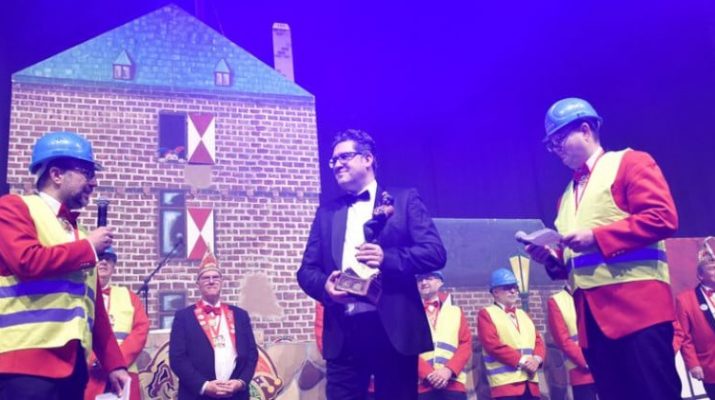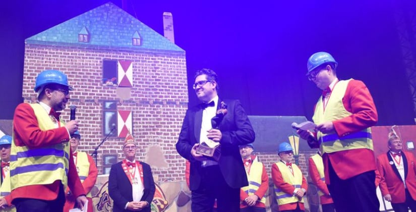 Foto: Thomas Spekowius (Für den Intendanten und Geschäftsführer sowie künftigen Hausherrn der Kulturraffinerie K714, Martin Witkowski (M.), gab es von den Karnevalisten einen Ehrenschelm)
