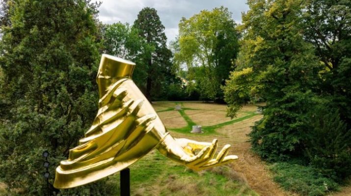 Bereits 2023 entstand im Rahmen der Monheim Triennale ein einzigartiges Zusammenspiel von Klangbrunnen, Licht und Skulpturen, das Wilson eigens für das Festival „The Sound“ entwarf. Die Stadt erwarb die Arbeit, um sie dauerhaft zu erhalten und weiterzuführen. Nun wurde das Ensemble durch ein finales Element ergänzt: eine vergoldete Hand, die in neun Metern Höhe über der Wiese thront. Die Skulptur erhebt sich aus einem in Falten liegenden Gewand und ist so positioniert, dass sie die Sichtachse der drei Klangbrunnen aufnimmt. Besonders bei Sonnenuntergang entfaltet sie ihre Wirkung und scheint eine Brücke zwischen Erde und Himmel zu schlagen.